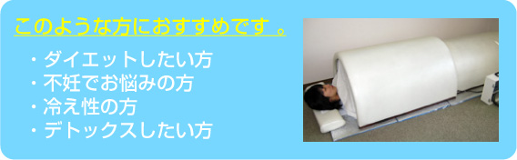 温泉やお風呂のように、毛細血管が水圧で圧迫されないため、大変楽です。 寝た姿勢で入ることで心身ともにリラックスできます。 健康の大原則である、頭寒足熱の温度分布になっています。30分寝るだけで、体の深部から500cc~1200ccもの濃い汚い汗が出ます。 出てきた汗は有害重金属を含んでいるため、何年たっても腐りません。