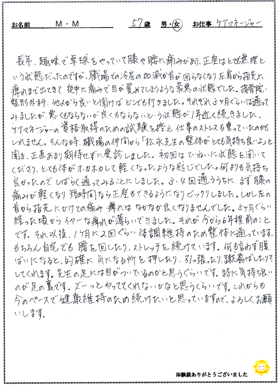 そんな時、職場の仲間から「松永先生の整体がとても気持ち良いよ」と聞き、正直あまり期待せずに受診しました。初回はていねいに状態を聞いてくださり、とても体がホカホカして軽くなったような感じでした。何よりも気持ち良かったのでしばらく通ってみることにしました。3,4回通ううちに、まず膝の痛みが軽くなり短時間なら正座もできるようになりビックリしました。しかし左の首から指先にかけての痛み・痺れはなかなか良くなりませんでした。3カ月ぐらい経った頃からイヤーな痺れが薄らいできました。